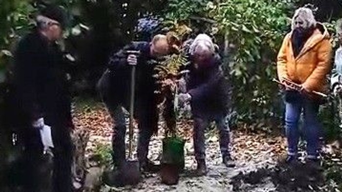 Und so trafen sich Blechbläser:innen und Sänger:innen an einem Mittwochabend und pflanzten eine Eberesche und eine Kornelkirsche in den Pfarrgarten hinter der Auferstehungskirche.