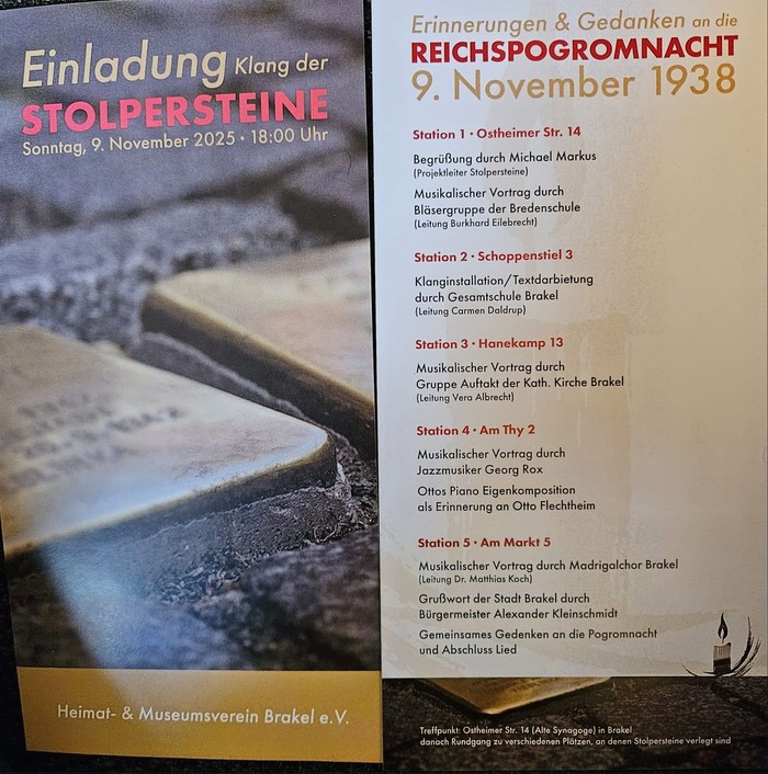 Der Heimat- & Museumsverein Brakel e.V. lädt dieses Jahr am 09. November ab 18:00 Uhr zu einem Rundgang durch Brakel mit 5 Stationen zum Gedenken und Erinnern an die Reichspogromnacht vom 9.11.1938 ein: