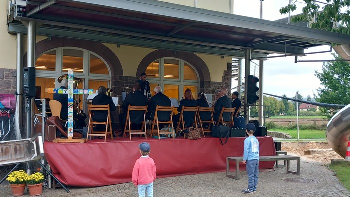 Wegen des Wetters wurde die Feier in die Schule verlegt. Der Posaunenchor Elbrinxen-Lügde spielte überdacht auf der Bühne -bei geöffneten Fenstern- in die Schule hinein. ...und es funktionierte... daran werden sich alle bestimmt noch lange erinnern!